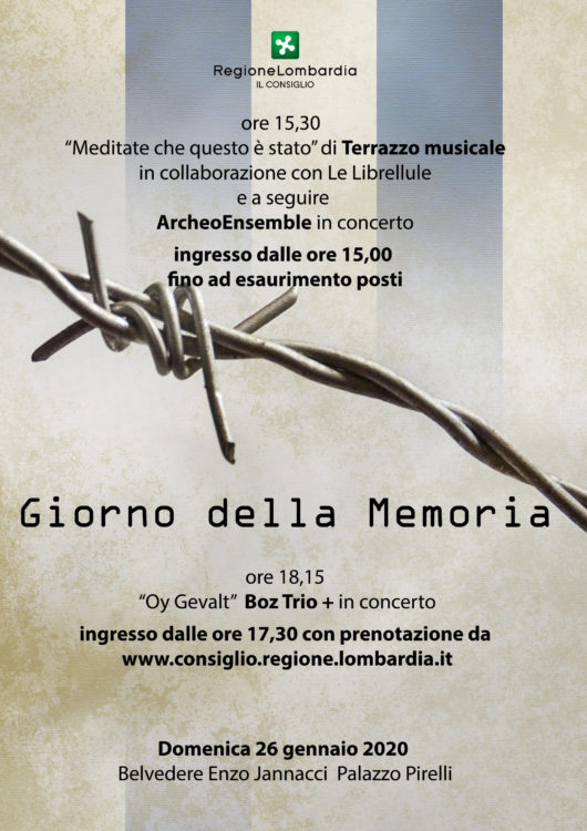 domenica 26 gennaio riparte la stagione musicale al Palazzo Pirelli. In occasione delle celebrazioni del giorno della memoria al Belvedere Jannacci sono in programma 2 concerti con unico filo conduttore: la musica Klezmer, il genere musicale tradizionale delle comunità ebraiche dell’Europa orientale e diffuso in tutto il mondo a seguito delle migrazioni dei gruppi originari, soprattutto durante la Seconda guerra mondiale per sfuggire alle persecuzioni razziali.