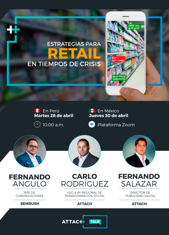 Pensando en esa necesidad, la consultora de negocios digitales Attach ha creado para este próximo 28 de abril a las 10 a.m. un webinar especializado para el sector retail de Perú sobre “Estrategias para Retail en tiempos de crisis”.
