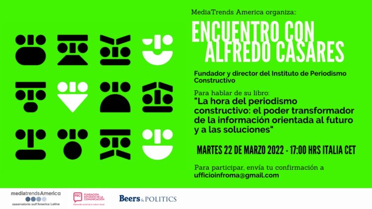 Enviamos información sobre el Encuentro online con Alfredo Caceres, el próximo día 22 de marzo 2022 a las 17:00h (CET Italia), para hablar sobre «La hora del periodismo constructivo”.