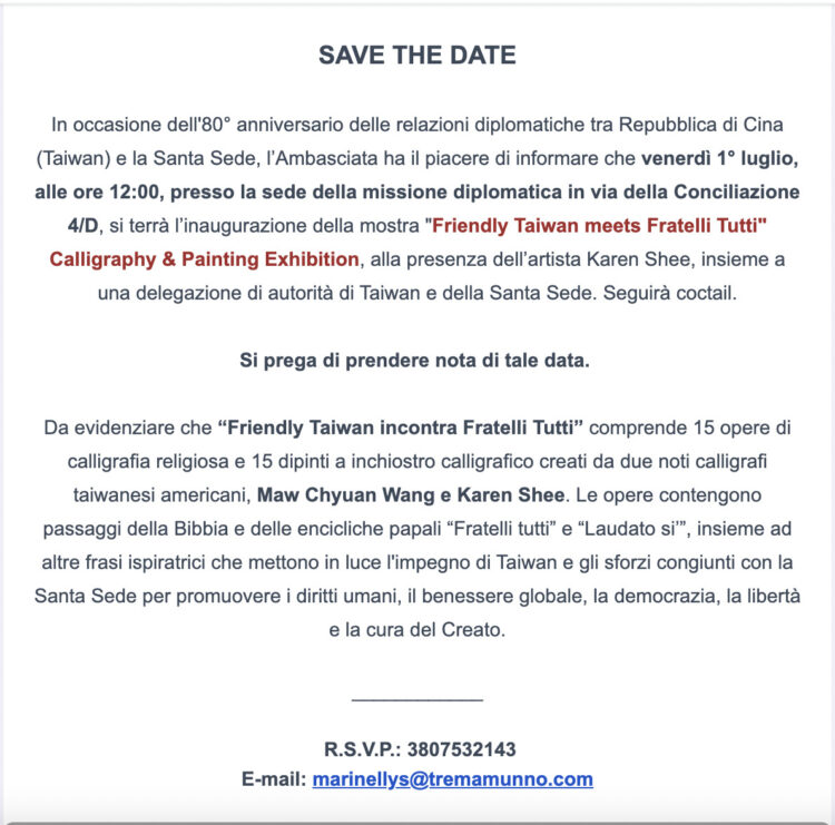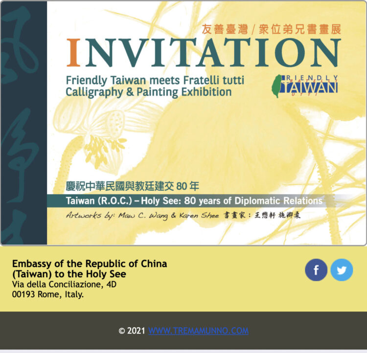01 luglio, ore 12:00 | Opening Friendly Taiwan meets Fratelli Tutti Calligraphy & Painting Exhibition