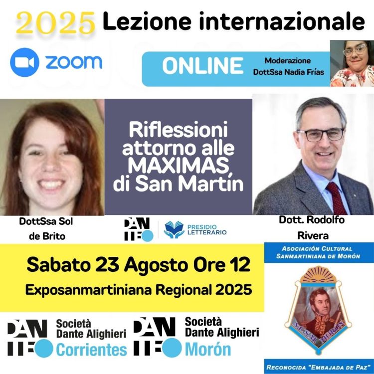Lezione aperta in onore al General José de San Martín, simbolo della nostra Nazione. La lezione sarà tenuta in lingua italiana con la partecipazione del Presidente dell’Istituto Sanmartiniano di Italia, il Dott. Rodolfo Rivera. Organizzata da Dante Morón, Dante Corrientes, Asociación Sanmartiniana di Morón e Istituto Sanmartiniano di Italia.