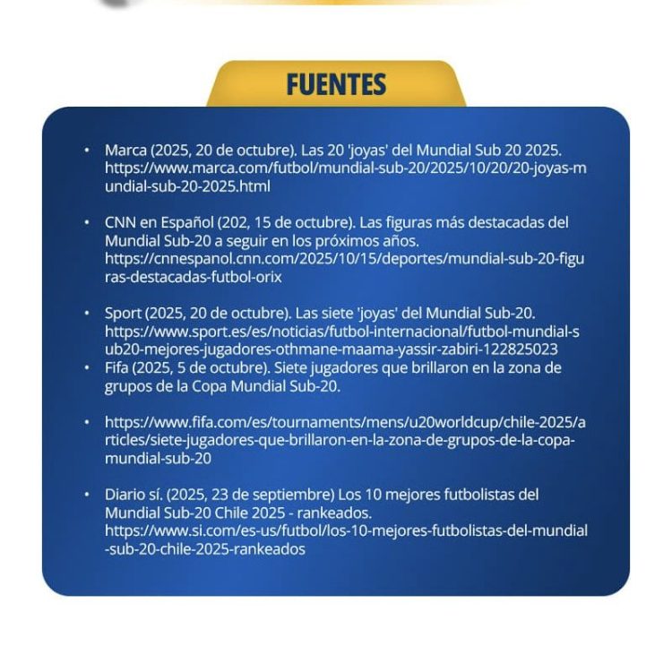 Esta información se basa en una infografía realizada por Marcadores 247, que recopila y destaca el desempeño de estas nuevas promesas durante el Mundial Sub-20, ofreciendo una mirada clara sobre los talentos que empiezan a ganar protagonismo en el panorama internacional.