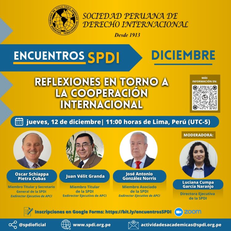 Tenemos el agrado de invitarlos al Encuentro SPDI de diciembre, ocasión en la que abordaremos el tema «Reflexiones en torno a la Cooperación Internacional», guiados por destacados especialistas en la materia.
