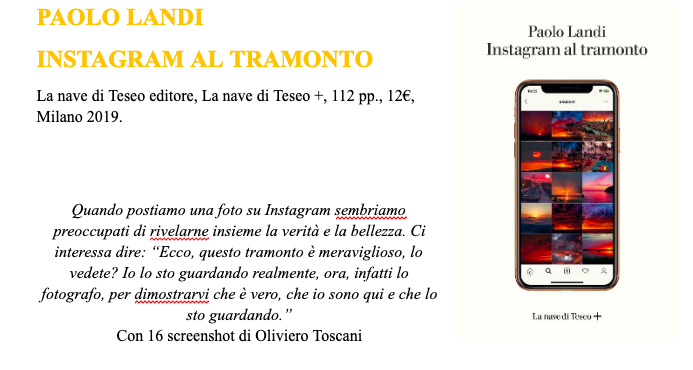 All’imbrunire Instagram ha un’impennata di “like”: perché milioni di persone, in tutto il mondo, sentono il bisogno di condividere l’immagine del sole che cala? Consultiamo Instagram in modo talmente compulsivo ormai da trascurare di interrogarci sul perché lo facciamo. Paolo Landi, con la sua lunga esperienza nel mondo della comunicazione, crede di aver compreso come mai postiamo le foto del cane, di un tramonto e di una pizza. E, con puntigliosità pedagogica, vuole condividere queste scoperte: avrebbe voluto farlo in modo ironico e leggero, poi l’enormità dell’ipermercato sempre aperto che si nasconde dietro Instagram lo ha impressionato e il resoconto ha preso un tono qua e là apocalittico. Ma si è divertito a scriverlo, rivelando prima di tutto a sé stesso le molte facce di questo social, che seduce e coinvolge, portandoci a condividere pezzi della nostra vita, senza mai farci sospettare che le merci in vendita sui suoi scaffali planetari siamo noi. Nel libro, sedici immagini di Oliviero Toscani sintetizzano i punti salienti del testo, quasi un piccolo reperto di archeologia del presente.