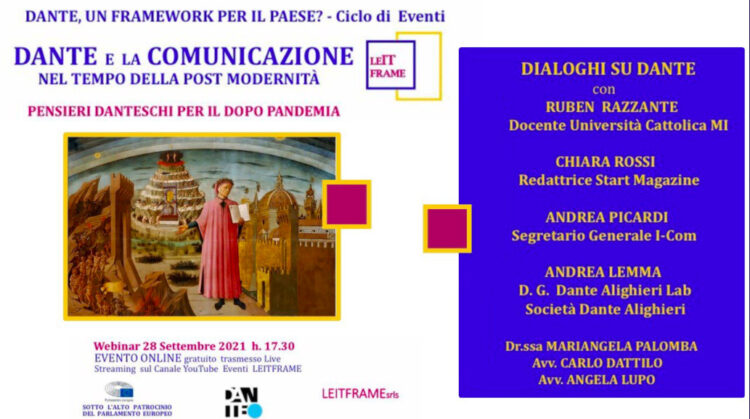 “Dante e la COMUNICAZIONE nel tempo della post modernità – Pensieri danteschi per il dopo pandemia” Martedì 28 settembre alle 17.30 secondo evento online del Ciclo “Dante, un framework per il Paese?”: qui la diretta: