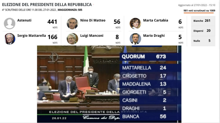 Los votos, en el cuarto día de votación, no han producido alguna mayoría, en la víspera del último día, los líderes políticos se reúnen para definir un nombre común. Entre los candidatos surgieron tres mujeres: Letizia Moratti, ha sido alcaldesa de Milán, de centro-derecha; Elisabetta Belloni, diplomática quien hace siete meses fue nombrada por Draghi, Secretaria general del Ministerio de Exteriores, tiene a su cargo los “Servicios Secretos”, tutela la realidad escondida de cada figura política; y la presidenta del Senado, Elisabetta Casellati, quien prudentemente se retiró, siendo de derecha podría ser masacrada en los votos poniendo en dificultad su cargo de presidenta del Senado. Han surgido varios candidatos, desde la reelección de Sergio Mattarella, quien debería recibir una gran mayoría de votos para que acepte un nuevo mandato; Pier Ferdinando Cassini, político que no pertenece a una casa política, siendo más centrista podría recoger mayor consenso; Mario Draghi, a los pro y contra, se agrega que debe quedarse como presidente del Consejo para actuar el programa económico cumpliendo los parámetros de la Unión europea.