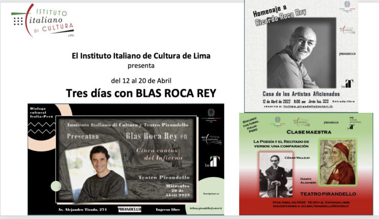 El reconocido actor ítaloperuano Blas Roca Rey, que ha realizado innumerables giras teatrales en Italia y otros países europeos y ha participado en filmes de prestigio, ofrecerá el espectáculo “Dante – Cinco cantos del Infierno” este miércoles 20 de abril a las 8 de la noche en el Teatro Pirandello (Avenida Alejandro Tirado 274 – Santa Beatriz). La entrada es gratuita. “Dante – Cinco cantos del Infierno” agrupa los cinco cantos más conocidos de La Divina Comedia: el primero, el quinto (Paolo y Francesca), el vigésimo sexto (Ulises), el trigésimo segundo (Conte Ugolino) y el trigésimo tercero, el último. Alternado y enriquecido por algunos comentarios y reflexiones de Blas Roca Rey. El espectáculo estará acompañado de música en vivo y tiene una duración de una hora. La Divina Comedia es la obra maestra de Dante Alighieri y es universalmente considerada una de las más grandes obras de la literatura de todos los tiempos, así como uno de los testimonios más importantes de la civilización medieval; tanto es así, que es conocida y estudiada en todo el mundo. “Se dice que muchas personas en otros países, estudian el idioma y aprenden italiano con el único fin de leer el texto en su idioma original”, expresa Blas Roca Rey. “Presentaremos la verdadera historia de Paolo y Francesca, las pequeñas ‘mentiras’ contadas por Dante sobre el Conde Ugolino, un monólogo que he escrito hablando con Ulises en primera persona, que da un punto de vista diferente al habitual sobre su famosa leyenda y otras pequeñas digresiones”, añade. “El resultado simplemente quiere acercar lo más posible los versos de Dante a la gente y, obviamente respetándolos, hacer que la velada sea un poco sorprendente respecto a lo que cabría esperar”, concluye. Él ha sido invitado por el Instituto Italiano de Cultura de Lima, en el marco de “Tres días con Blas Roca Rey” del proyecto “Diálogo Cultural Italia-Perú”, que comprende además un homenaje al inestimable director de teatro, Ricardo Roca Rey (tío de Blas) y que tendrá lugar el 12 de abril a las 11 de la mañana en la sede histórica de la Asociación de Artistas Aficionados, en cuyo recorrido de ya casi 84 años de ininterrumpida labor fue determinante Don Ricardo Roca Rey, quien fue uno de los fundadores de la AAA y su director por más de 30 años. Además, el 19 de abril a las 6.30 de la tarde en el Teatro Pirandello, Blas Roca Rey ofrecerá una clase maestra dirigida a actores, estudiantes de artes escénicas y aficionados, denominada “La poesía y el recitado de versos”. Será una pequeña guía para no atemorizarse ante la poesía, cuya lectura es más bien fascinante. Durante la charla se hará un paralelo con el inmenso poeta peruano César Vallejo, con su escritura, sus versos desesperados y profundos. Y también nos aventuraremos a leer sus letras.