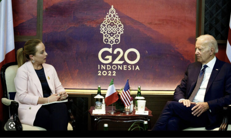 En Bali, sostuvo un encuentro bilateral al margen de los trabajos de la Cumbre de Países del G20 con el Presidente de los Estados Unidos Joseph R. Biden. Un acuerdo sobre el Gas, es decir un «descuento» sobre el precio del abastecimiento de los Estados Unidos para evitar una «crisis social» que corre el riesgo de explotar si aumenta el precio de la energía. Si a esto Biden se comprometió con Giorgia Meloni, él le pidió una revisión de los Acuerdos con China firmados por Giuseppe Conte, cuando era Primer ministro, los denominados «Via della Seta». Por otro lado, quedó confirmado el apoyo de Italia a Ucrania en armamentos en la guerra que ha generado Rusia.