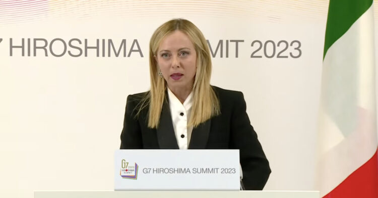En su Conferencia de Prensa antes de dejar Hiroshima resumió los temas tratados, en primer lugar el conflicto en Ucrania, los errores cometidos en el pasado y como de deba, hoy, invertir la tendencia en, por ejemplo, seguridad para la economía, la cadenas de abastecimiento, la coerción económica, las relaciones con el sur global, algunos de sus miembros llegaron al G7, «la necesidad de superar esa narrativa de un Occidente contra el resto del mundo porque este no es el conflicto, el conflicto nació, en cambio, con un conflicto donde los ucranianos defienden, en el ámbito del derecho internacional, que no fue adecuadamente defendido en los lugares predispuestos, otro tema la inteligencia artificial», un tema que Meloni lo había ya propuesto en el Consejo de Europa, un tema muy vinculado a la democracia, porque “tal vez no nos damos cuenta que el progreso esté corriendo más veloz que nosotros, y, el riesgo que corremos, sin darle importancia, decimos que es el futuro inmediato. Futuro que nos encontramos al frente en una sociedad, en la cual, el progreso no sirve más a optimizar las capacidades humanas, sino que, corremos el riesgo de llegar a sustituir las capacidades humanas, por lo tanto, se crea un problema de desigualdades que aumentan y de democracias que corren el riesgo de debilitarse”.