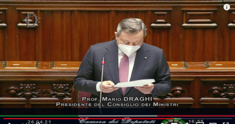 El Presidente del Consejo, Mario Draghi, ante el Senado presentò el PNRR que será enviado a la Comisión europea, con la siguientes palabras: «Todos estaríamos equivocados al pensar que el Plan Nacional de Recuperación y Resiliencia, a pesar de su importancia histórica, es solo un conjunto de proyectos tan necesarios como ambiciosos, de cifras, objetivos, plazos. Le sugiero que lo lean también de otra manera. Ponga la vida de los italianos, la nuestra pero sobre todo la de los jóvenes, las mujeres y los ciudadanos por venir. Las expectativas de quienes más han sufrido los efectos devastadores de la pandemia. Las aspiraciones de las familias preocupadas por la educación y el futuro de sus hijos. Las justas reclamaciones de quienes no tienen trabajo o lo han perdido. Las inquietudes de quienes han tenido que cerrar su negocio para que todos podamos frenar el contagio. La ansiedad de los territorios desfavorecidos por liberarse de las penurias y la pobreza. La conciencia de cada comunidad de que el medio ambiente debe ser protegido y respetado. Pero, en el conjunto de los programas que les presento, está también y sobre todo el destino del país. La medida de cuál será su papel en la comunidad internacional. Su credibilidad y reputación como fundador de la Unión Europea y protagonista del mundo occidental.