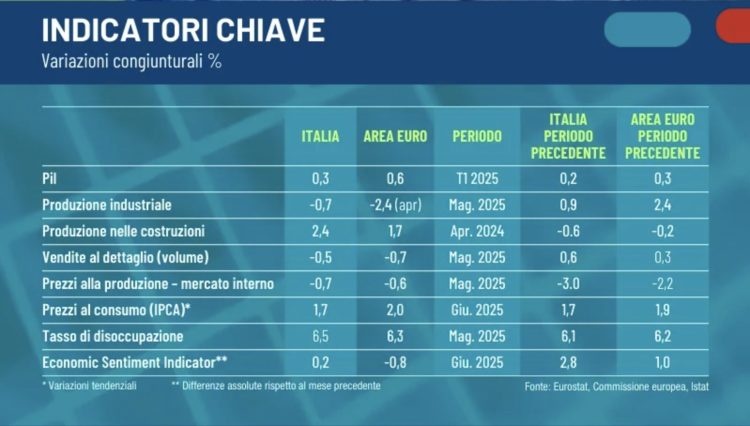 El debilitamiento de la confianza empresarial y del consumidor se vio influenciado en gran medida por el alto nivel de incertidumbre derivado de la sucesión de anuncios sobre la imposición de aranceles al comercio internacional. Sin embargo, el comercio exterior italiano parece haberse beneficiado no solo de los contratos largamente planificados en el sector de la construcción naval, sino también de un efecto de anticipación: la inminente imposición de restricciones arancelarias podría haber acelerado las transacciones, tanto de entrada como de salida, en el primer trimestre de 2025 (variaciones intertrimestrales del 2,6 % y el 2,8 % para las importaciones y exportaciones de bienes y servicios, respectivamente).