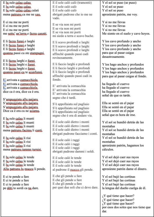 Aquí un ejemplo de una canción de protesta de parte de los trabajadores que no pudiendo enfrentarse al patrón, «se las cantan». La primera columna está en el dialecto del Salento, la segunda columna en italiano y la tercera columna en castellano.