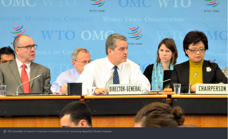 «Obviamente, la parálisis del Órgano de Apelación no significa que la solución de controversias basada en normas se haya detenido en la OMC», continuó la DG Azevêdo. «Los miembros continuarán resolviendo las disputas de la OMC a través de consultas, paneles y otros medios previstos en los acuerdos de la OMC, como el arbitraje o los buenos oficios de la DG … pero no podemos abandonar lo que debe ser nuestra prioridad, es decir, encontrar una solución permanente para el Órgano de Apelación «.