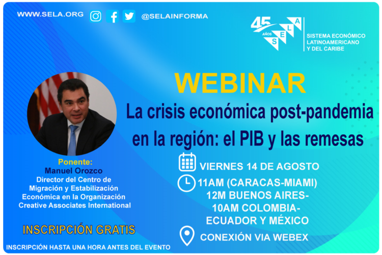La Secretaría Permanente del Sistema Económico Latinoamericano y del Caribe (SELA) invita al seminario web: La crisis económica post-pandemia en la región: el PIB y las remesas que se llevará a cabo el día 14 de agosto de 2020, a las 11:00 a.m Caracas. Este evento será transmitido en español.
