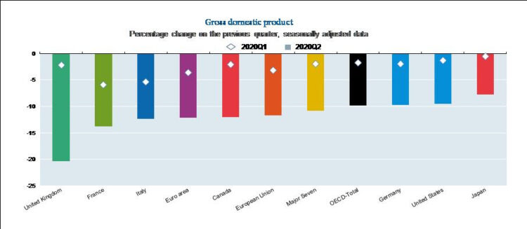 El crecimiento interanual del PIB para el área de la OCDE fue de menos 10,9% en el segundo trimestre de 2020, luego de un crecimiento de menos 0,9% en el trimestre anterior. Entre las siete economías principales, Estados Unidos registró un crecimiento anual de menos 9,5%, mientras que Reino Unido registró la caída anual más pronunciada (menos 21,7%).