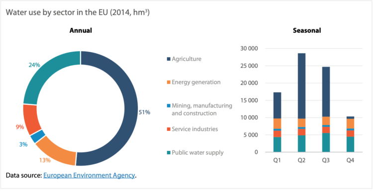 Datos de la Agencia Europea de Medio Ambiente sobre el uso del agua por sector en la Unión Europea indica que el riego en la agricultura representa aproximadamente la mitad del agua utilizada anualmente (abasteciendo al 8-9% de la superficie total de cultivo), con grandes variaciones estacionales y geográficas.