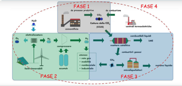 El proyecto incluye varios objetivos intermedios como la estimación de la producción de dióxido de carbono a escala regional (Emilia-Romagna); el análisis del CO2 capturado por el proceso de producción; la construcción, con diferentes tecnologías, de plantas experimentales para la producción de CO2 e hidrógeno verde (este último producido con la electrólisis del agua mediante el uso de electricidad procedente de fuentes renovables); el análisis de la cadena de suministro potencial para el uso de combustibles neutros en carbono en el transporte y la industria caracterizada por importantes emisiones de CO2 del ciclo de producción, como las fábricas de cemento.
