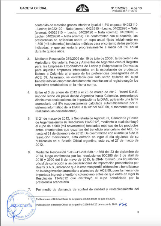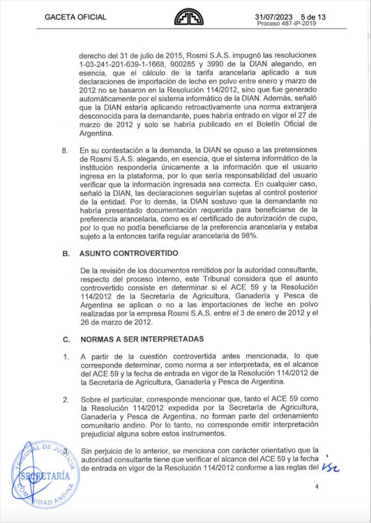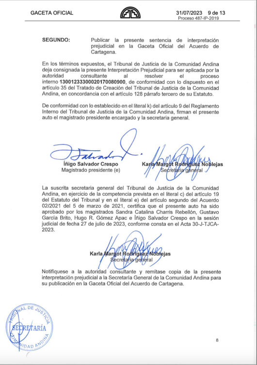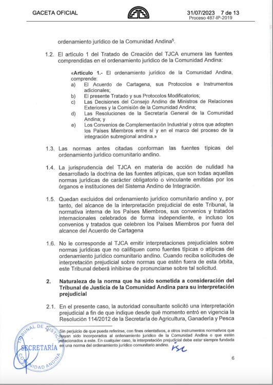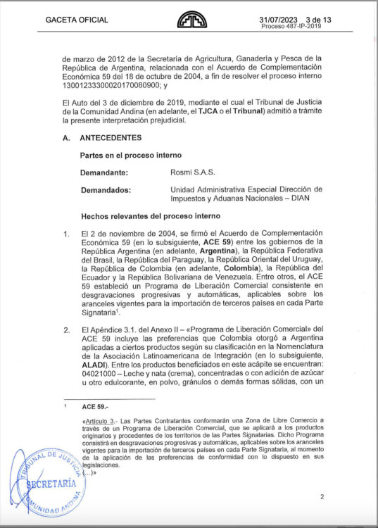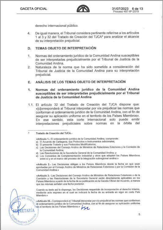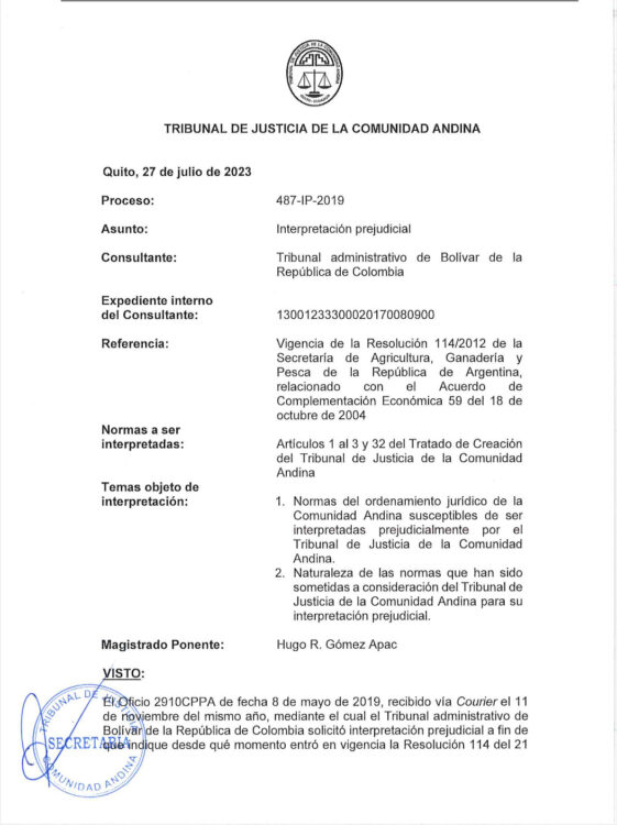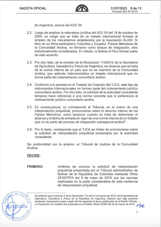 Tribunal de Justicia de la Comunidad Andina se inhibe de responder interpretación prejudicial sobre ACE-59 (Aladi) y norma argentina por no ser parte del Derecho comunitario andino.