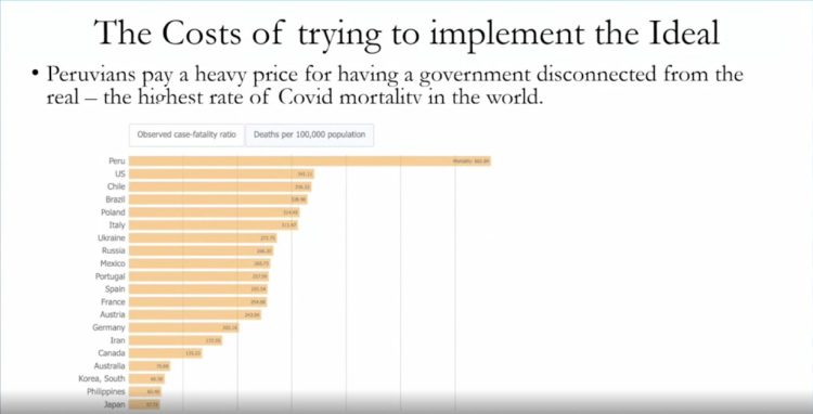También se refirió al valor simbólico y económico de los recursos naturales del Perú -el oro, el cobre, la riqueza minera- y advirtió que no significan lo que podrían significar en una sociedad con instituciones sólidas.