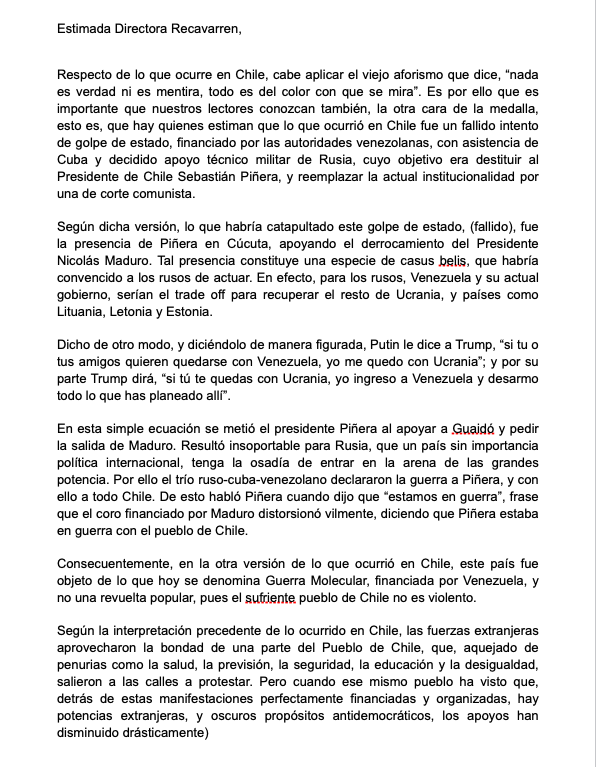 Según la interpretación precedente de lo ocurrido en Chile, las fuerzas extranjeras aprovecharon la bondad de una parte del Pueblo de Chile, que, aquejado de penurias como la salud, la previsión, la seguridad, la educación y la desigualdad, salieron a las calles a protestar. Pero cuando ese mismo pueblo ha visto que, detrás de estas manifestaciones perfectamente financiadas y organizadas, hay potencias extranjeras, y oscuros propósitos antidemocráticos, los apoyos han disminuido drásticamente)
