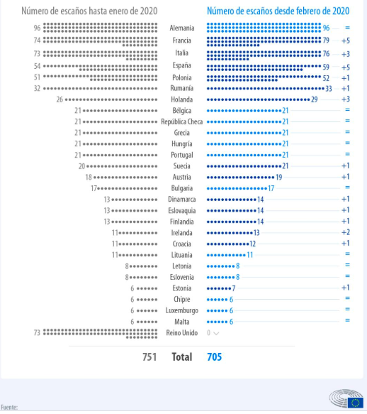 El Parlamento Europeo pasará a tener 705 miembros, frente a los 751 (número máximo que prevé el Tratado de la UE) que tenía antes de la retirada del Reino Unido el 31 de enero de 2020.