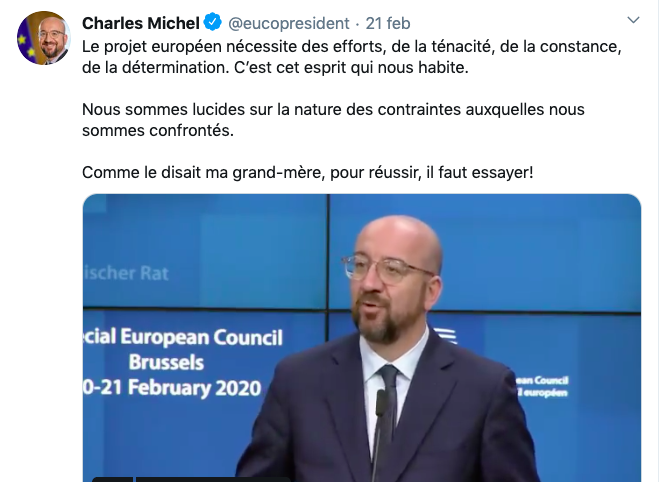 Los días 20 y 21 de febrero, los jefes de estado o de gobierno de la UE se reunieron en Bruselas para discutir el presupuesto a largo plazo de la UE para 2021-2027. Luego de intensas negociaciones se hizo evidente que no era posible llegar a un acuerdo y que se necesitaba más tiempo.