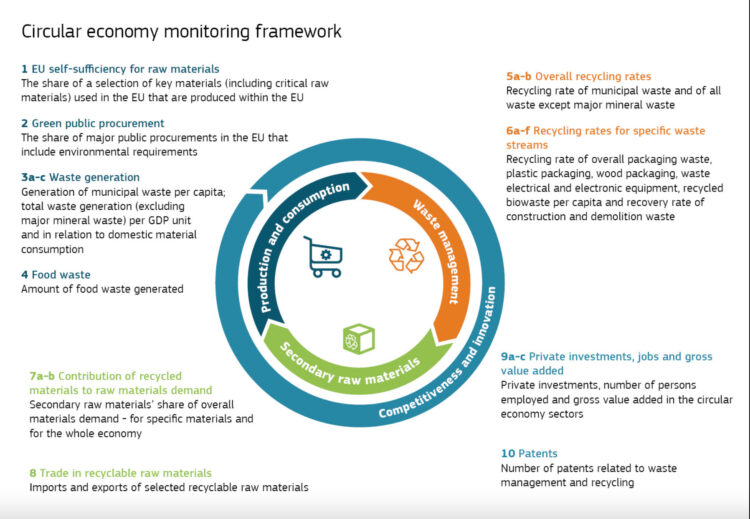 Por tanto, el plan de acción de la UE va acompañado de medios para supervisar el progreso hacia la economía circular. Para ello, se creó un marco de indicadores. Los indicadores desarrollados utilizan principalmente datos que ya se están recopilando mientras se toman las medidas necesarias para mejorar la calidad de estos datos. Este marco de indicadores complementa el «Cuadro de indicadores de la eficiencia de los recursos» y el «Cuadro de indicadores de las materias primas» que fueron desarrollados en los últimos años por la Comisión.