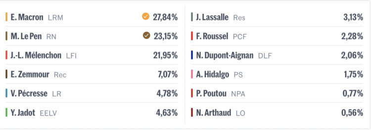 Macron y Mélenchon han sido los más votados en París. Luego de su buen resultado, quedando en tercer lugar, Mélenchon pidió a sus votantes: «No debemos dar un solo voto a Marine Le Pen», lo repitió tres veces a sus seguidores, al parecer no fue claro y ahora rectifica repitiendo el pedido. No obstante, no todo su electorado está de acuerdo con el pedido. Por ello, se considera que habrá un número de abstencionistas que votarán a Macron y una parte lo está pensando.