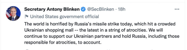 El portavoz de la ONU, Stephane Dujarric, aseguró que el ataque fue «deplorable», el secretario de Estado de Estados Unidos, Antony Blinken, calificó el impacto del misil  como «la última de una serie de atrocidades».