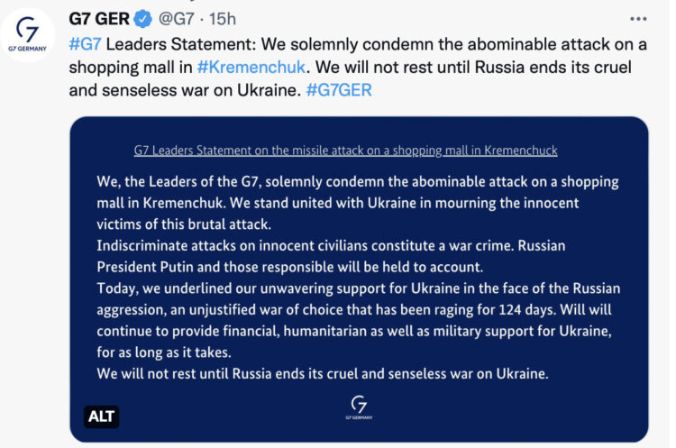 Mientras se realizaba la segunda jornada del G7, Rusia descargaba su ataque en diferentes puntos de Ucrania, el más cruel, por carecer de objetivo estratégico de guerra y ser estrictamente un deseo de Putin y de su guerra de destruir al pueblo ucranio fue el ataque con misiles que incendió un centro comercial en Kremenchuk, en el centro de Ucrania, han muerto mas de quince personas. El gobernador de la región de Lugansk dio cuenta de la muerte de al menos 8 muertos en la ciudad de Lysychansk. En la jornada, diversos puntos del territorio ucraniano han registrado ataques de las tropas invasoras.