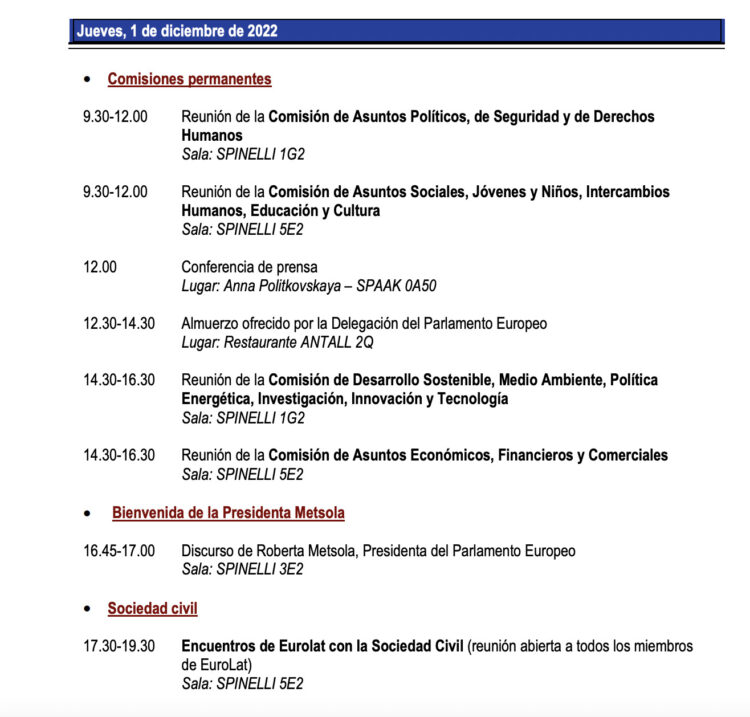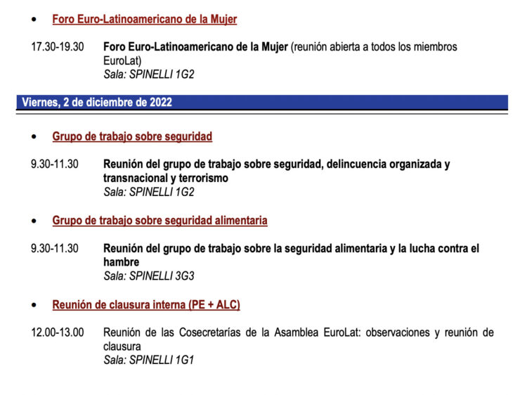 Las comisiones permanentes de la Asamblea EuroLat -Asuntos Políticos, de Seguridad y de Derechos Humanos; Asuntos Sociales, Jóvenes y Niños, Intercambios Humanos, Educación y Cultura; Desarrollo Sostenible, Medio Ambiente, Política Energética, Investigación, Innovación y Tecnología, y Asuntos Económicos, Financieros y Comerciales- votarán sendos informes, y también habrá un encuentro con representantes de la sociedad civil y un foro centrado en las mujeres.