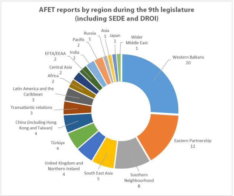 América Latina y el Caribe aparece con 3 informes durante la 9a legislatura. Aunque esto indica que ha habido una atención considerable, comparativamente, la región ha recibido menos enfoque que otras áreas, como los Balcanes Occidentales (20 informes) y la Asociación Oriental (12 informes).