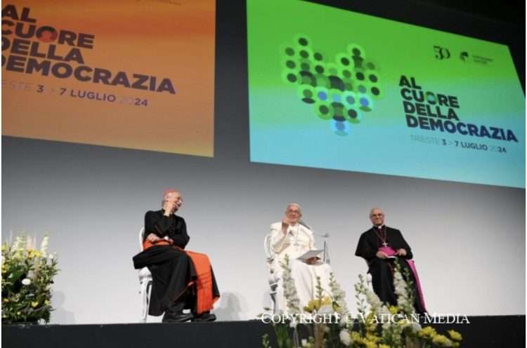 Papa Francesco a Trieste con il suo discorso conclude i lavori della 50ª Settimana sociale dei cattolici in Italia dal titolo “Al cuore della democrazia. Partecipare tra storia e futuro”, inaugurata il 3 luglio dal Presidente Sergio Mattarella. È il terzo viaggio pastorale del 2024 nel nord d’Italia.
